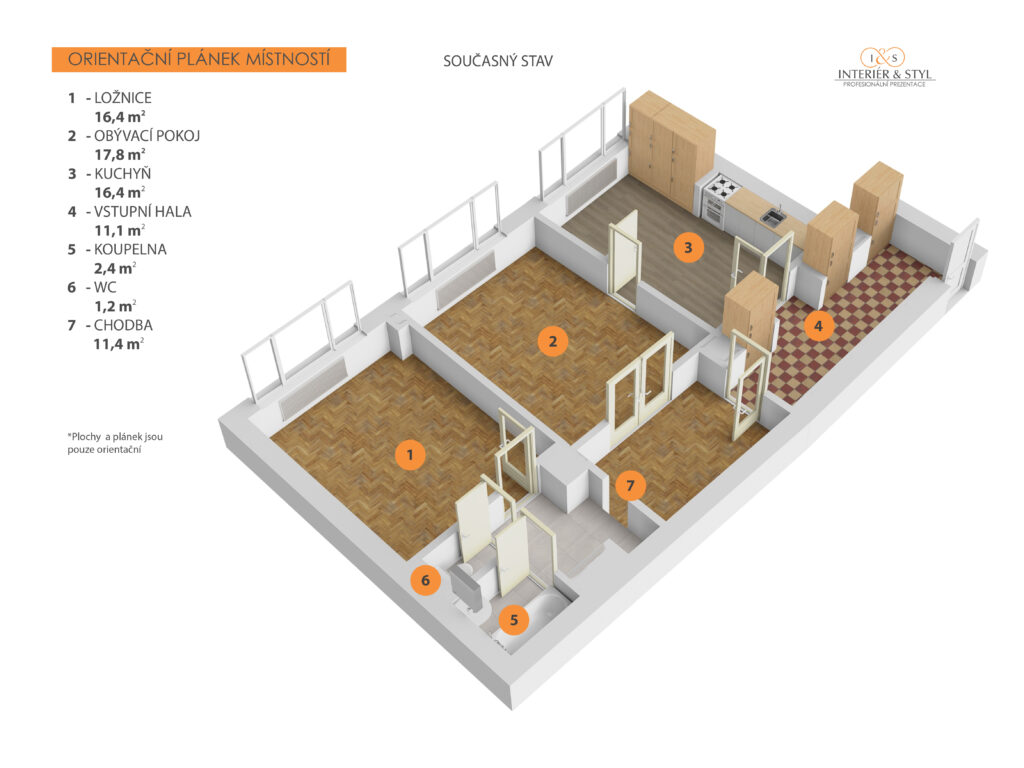 Byt je před rekonstrukcí, což nabízí ideální příležitost k vytvoření domova podle vlastních představ – pro inspiraci v náhledu fotografií několik vizualizací jak by byt mohl vypadat.